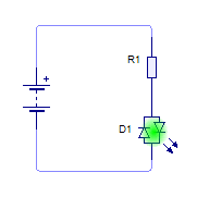 In this example we have assumed a battery voltage of 9 V, an LED with a forward voltage of 2 V and the current limited to 20 mA.