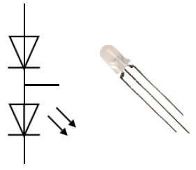 Contains two LEDs but has an additional centre lead. A third colour is achieved by switching on both LEDs at the same time.