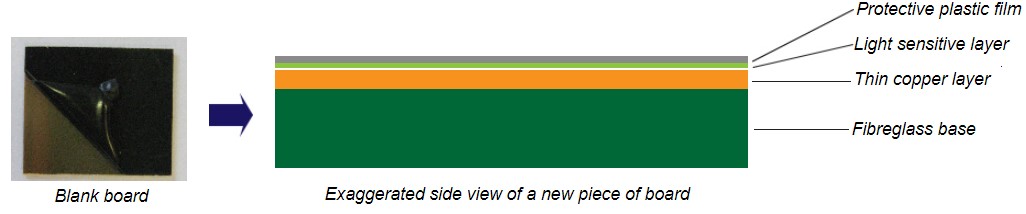 PCBs are made of laminations (layers) of different types of material. The diagram on the bottom right shows an exagerated cross section view of a brand new piece of PCB: